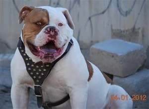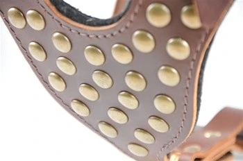 Een handgemaakt hondentuig voor de grotere hondenrassen. De borstplaat van dit hondentuigje is fraai gedecoreerd met messing studs.Â