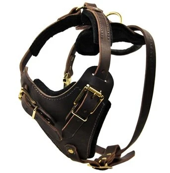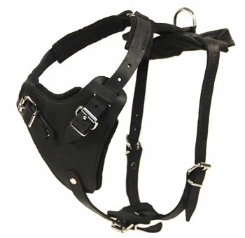 Een stoer en zeer hoogwaardig handgemaakt hondentuig voor de grotere hondenrassen met een grote gevoerde borstplaat.