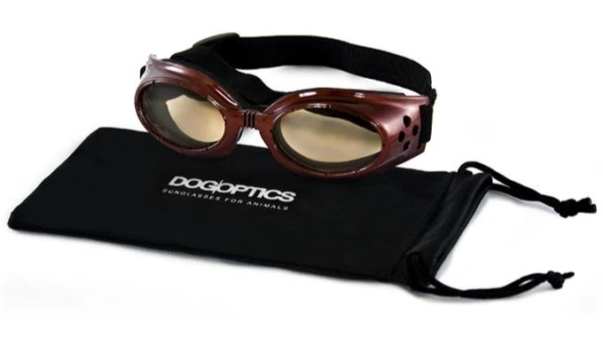 Deze bruine hondenzonnebril is voorzien van bruine glazen en wordt geleverd inclusief een opbergzakje.