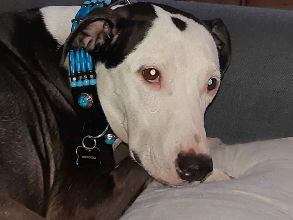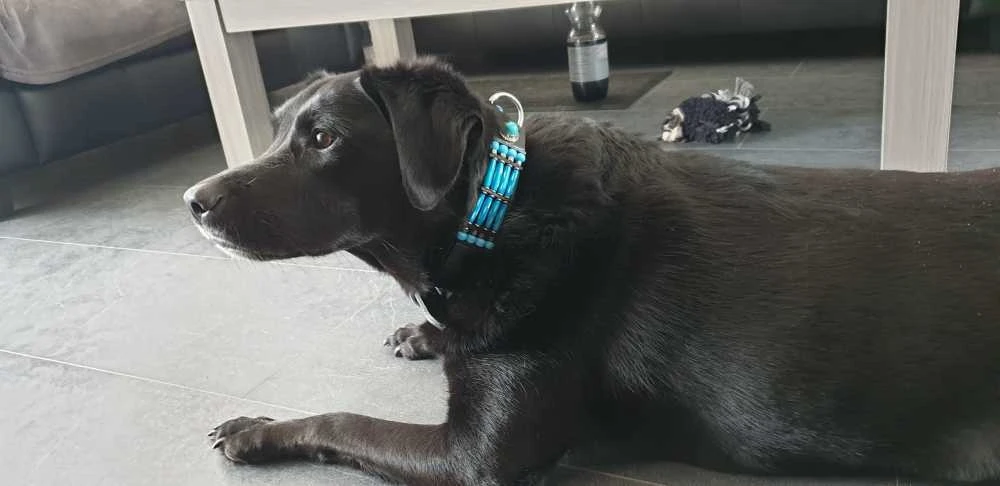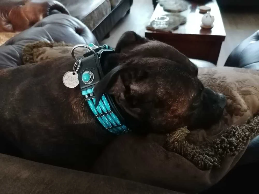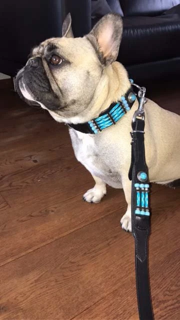 Deze opvallende en mooie halsband is gemaakt van stevig dubbellaags zwart leer. De hondenhalsband is heel opvallend door de prachtige blauwe elementen die extra opvallen op het zwarte leer. De halsband is gevoerd met zacht kalfsleer voor extra comfort voor uw hond. Dit is een grote maat dus perfect geschikt voor de grote hondenrassen !