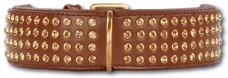 Een fraaie en opvallende bruin leren halsband die prachtige is afgezet met originele goudkleurige Swarovski kristallen. Deze halsband is 45 mm breed, en verkrijgbaar in verschillende lengtes tussen 60 cm en 75 cm.