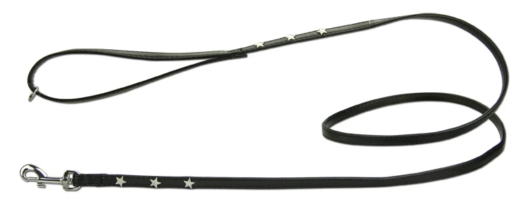 Een mooie zwarte kunstleren hondenriem die prachtig is gedecoreerd met zilverkleurige sterren.