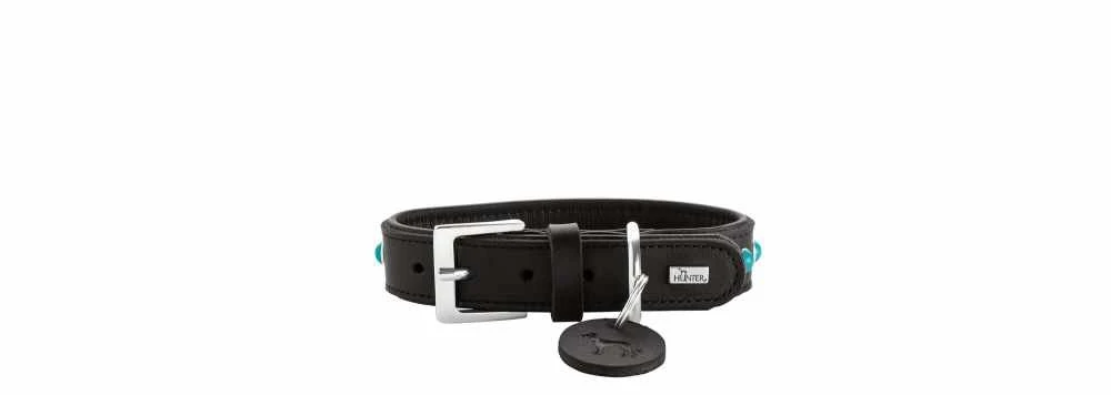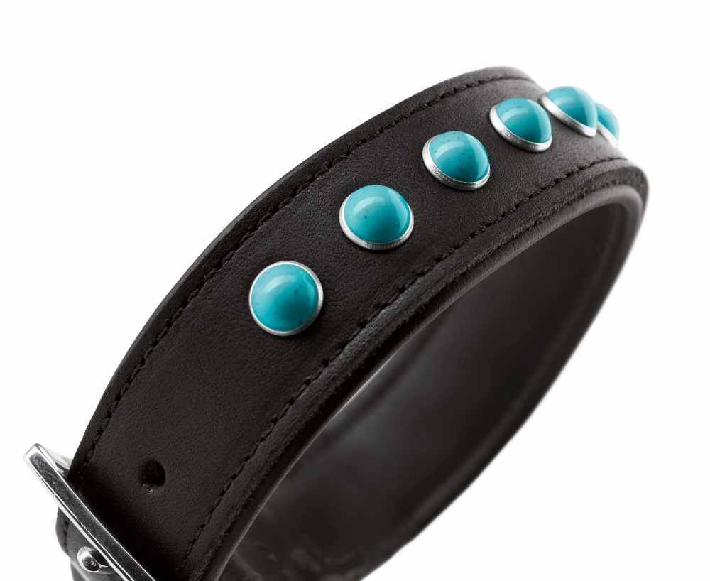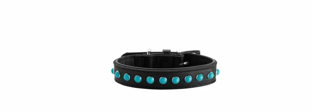 Deze halsband is een echte blikvanger ! Het veerkrachtige en slijtvaste rundleer is gevoerd met een zachte laag nappaleer. Door de gebogen verwerking van de voering is de halsband onvergelijkbaar zacht en ook erg zacht voor de vacht van de hond. Een pluspunt voor gevoelige viervoeters die niet zonder maximaal comfort willen. De bovenkant van de halsband, die geschikt is voor dagelijks gebruik, is versierd met turquoise edelstenen.