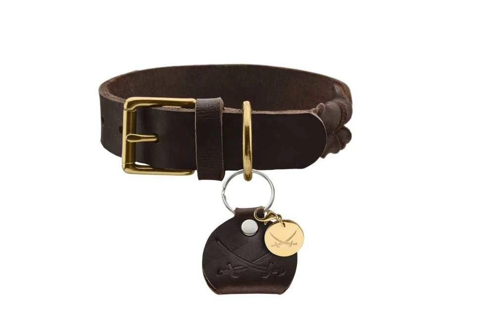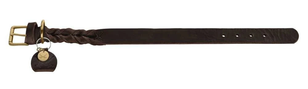 Deze elegante hondenhalsband is gemaakt van 100% rundleder. De met de hand gevlochten accenten vormen een mooi contrast met het minimalistische ontwerp. De D-ring en fittingen zijn van messing. De halsband heeft een afneembaar hangertje.