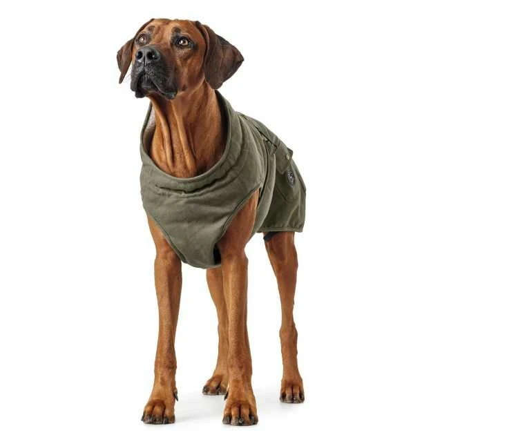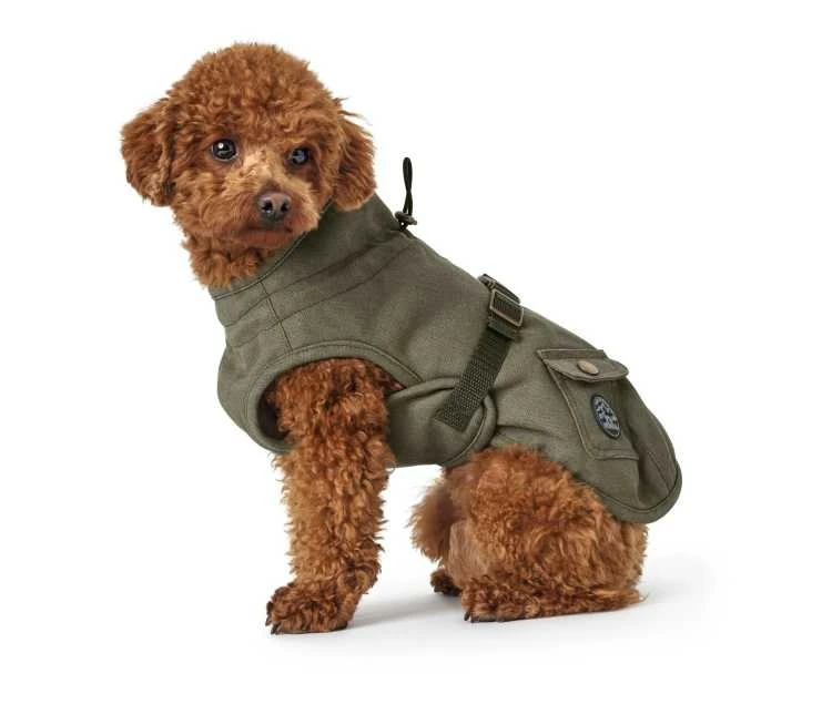 Dit is een robuuste en modieuze hondenjas in een parka look. De jas is gemaakt van katoen. Het jasje is gevoerd met zacht imitatie lamsbont dat de hond aangenaam warm houdt. De elastische bevestigingsbanden voor de achterpoten (variabel in positie en lengte) zorgen voor een perfecte pasvorm, ongeacht de lichaamsbouw van uw hond. De nek van de hondenjas is in de breedte verstelbaar door middel van een elastische band en heeft een opening voor de D-ring van een halsband.Â