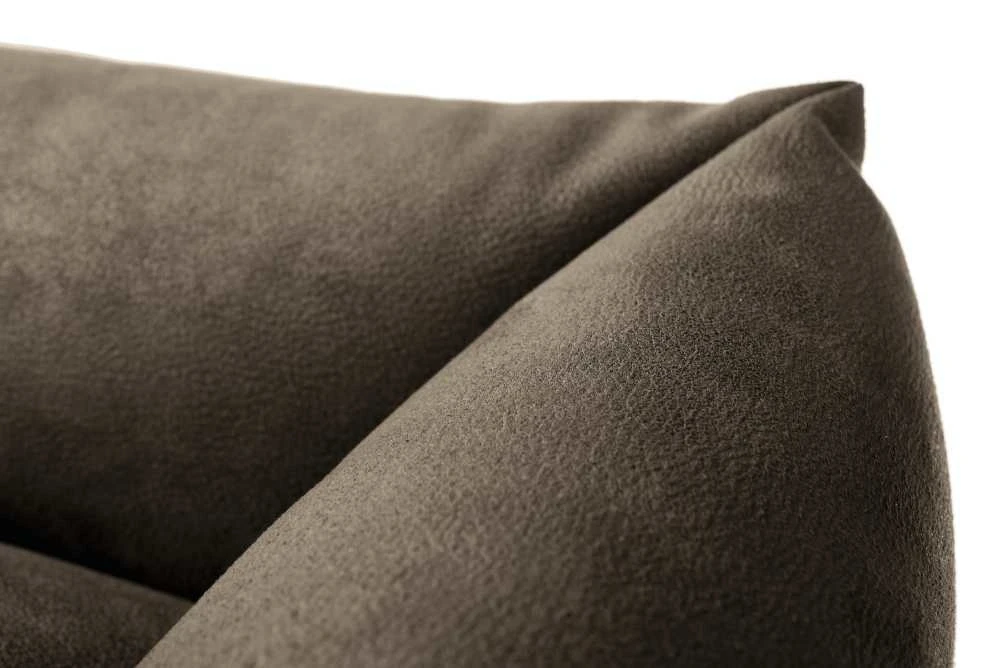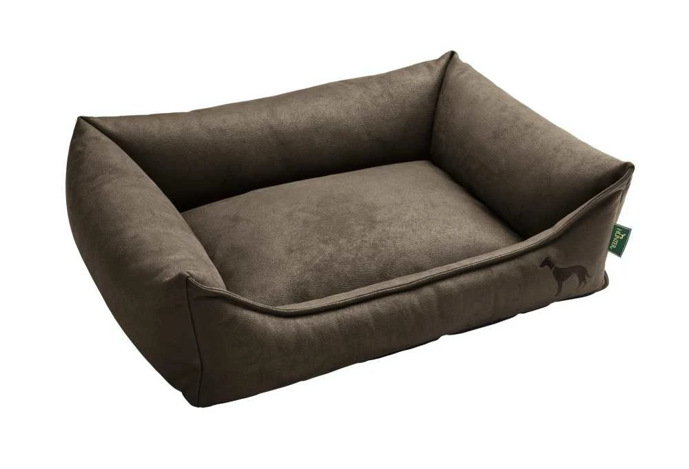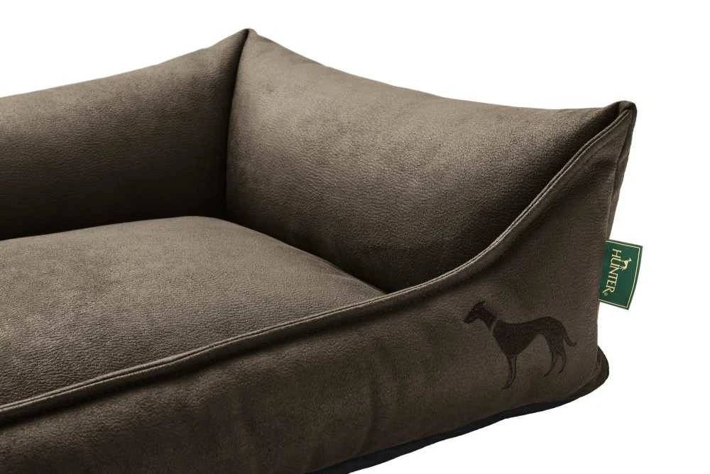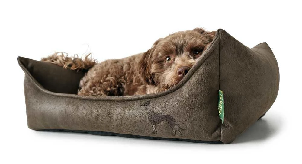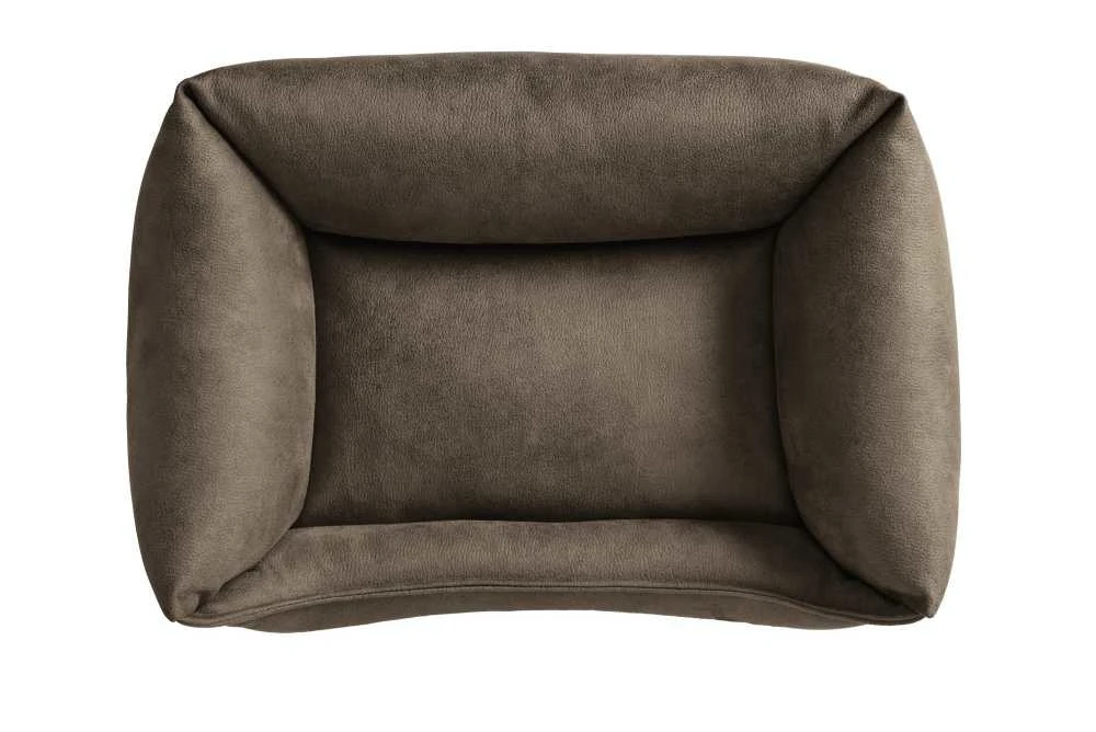 Een stijlvolle bruine kunstleren hondenmand die goed geschikt is voor honden die graag tegen een rand aan liggen.