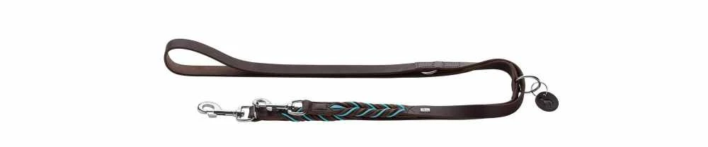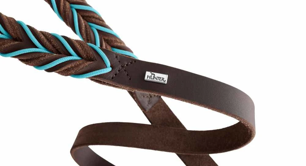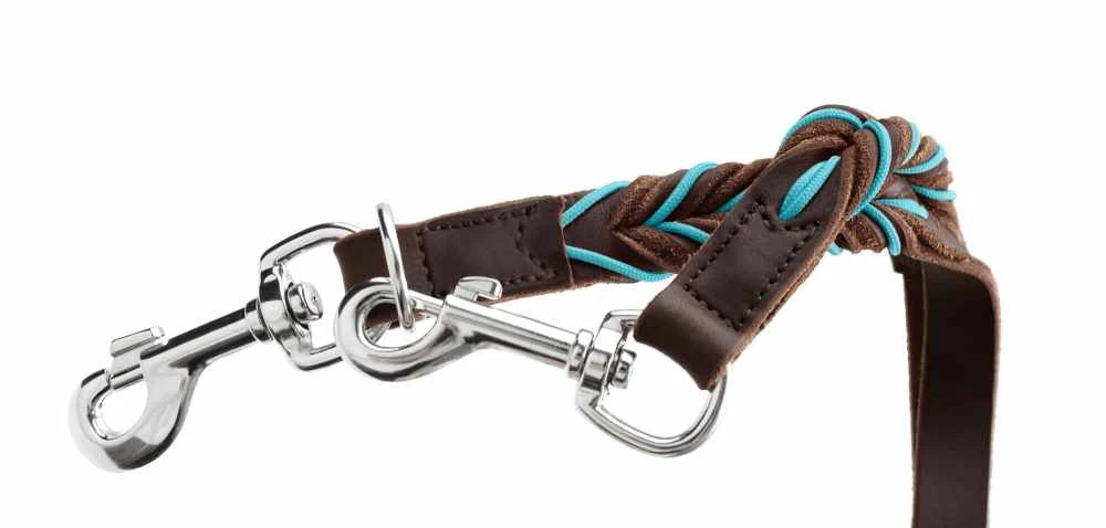 Een aangename wandeling begint met de keuze van de perfecte combinatie van halsband of harnas en hondenriem. Bij deze fraaie handgemaakte en verstelbare hondenriem ​​is gekozen voor rundleer met opvallend turquoise gevlochten polyester touw.