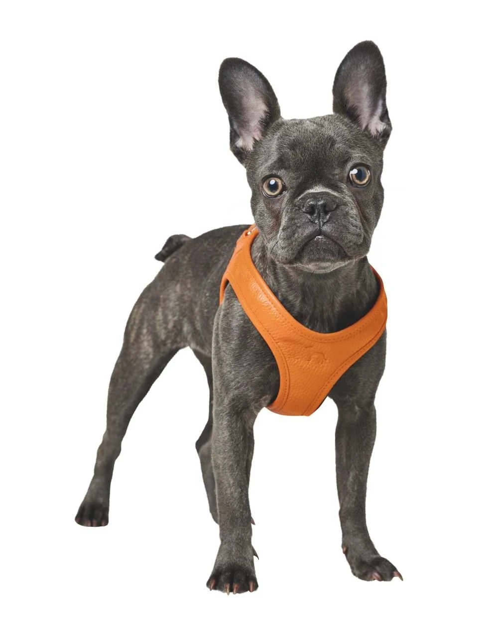 Dit is een modern en innovatief oranje hondentuig. Het hondentuig is gemaakt van zacht leer en is gevoerd met ademend mesh materiaal.