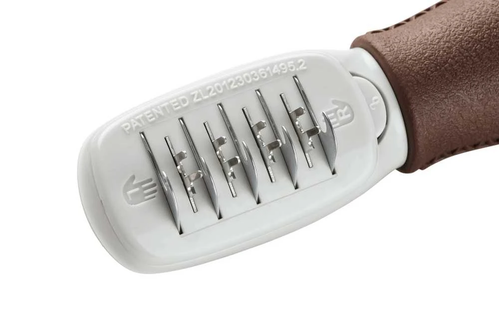 Deze kam biedt een buitengewoon praktische functie als het gaat om het verzorgen van de vacht: dankzij de draaibare kop is de kam geschikt voor zowel rechts- als linkshandige gebruikers. De kam maakt de vacht van het dier zacht en effectief glad en verwijdert klitten uit de ondervacht. Het gebruik van hoogwaardige roestvrijstalen veiligheidsmessen voorkomt blessures. De ergonomisch gevormde handgreep in hoogwaardige lederlook garandeert een gemakkelijk slipvast gebruik bij het verzorgen.