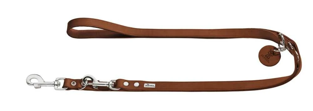 Deze cognac hondenriem is gemaakt van rundleer. Dankzij een royale toevoeging van olie en een natuurlijk verfproces, is de riem ook bestand tegen zware belasting. Hierdoor is deze hondenriem ook goed geschikt is voor hondensporten. U kunt de riem drievoudig verstellen.