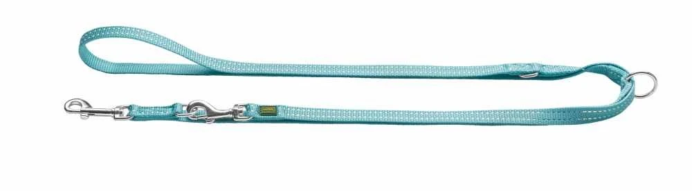 Een hippe en trendy hondenriem, geschikt voor puppy’s en kleinere honden, die is uitgevoerd in blauw nylon. Deze riem is drievoudig verstelbaar en heeft twee musketonhaken. De riem heeft speciale reflecterende strips, die in het robuuste en weerbestendige nylon materiaal zijn verwerkt. Deze strips reflecteren het licht in regenboogkleuren.Â