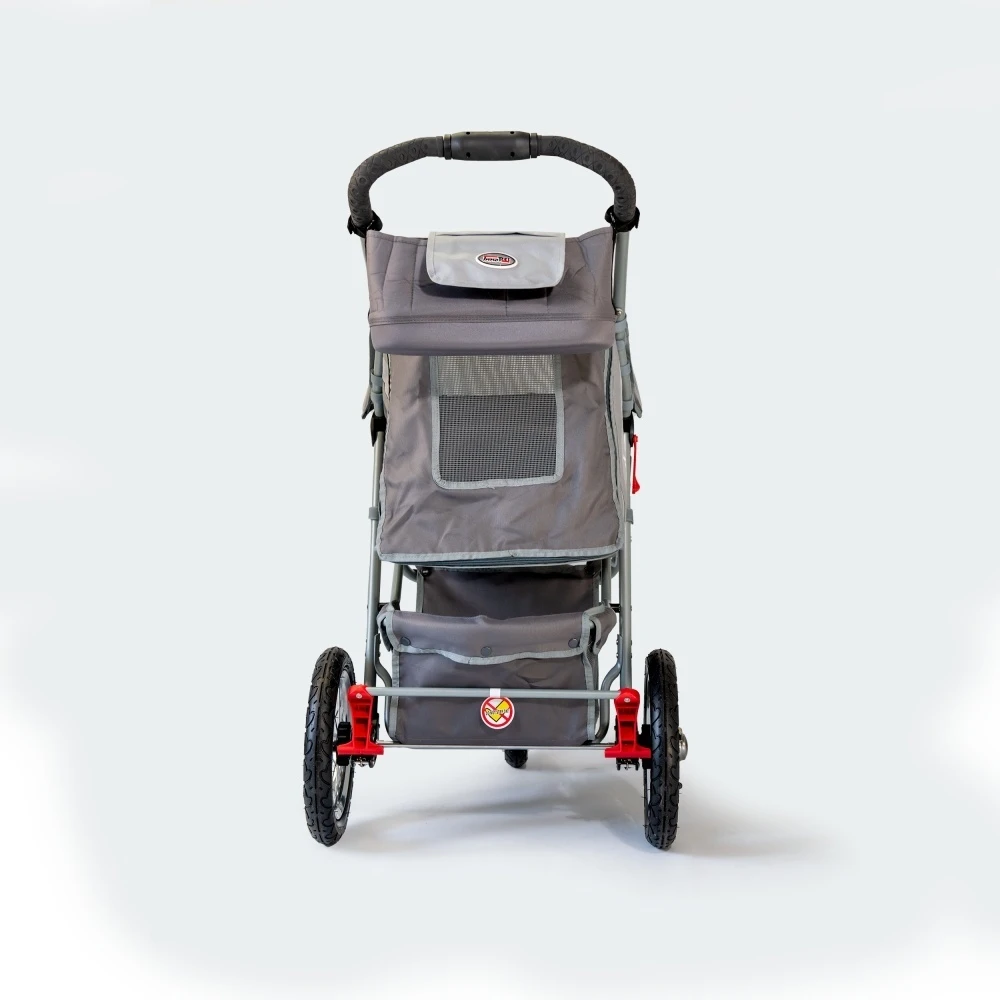 Dit is een luxe grijze hondenbuggy met 12 inch luchtbanden voor maximaal comfort, die geschikt is voor honden tot 25 kg. Deze buggy behoort tot de topmodellen van Innopet. Het frame is geanodiseerd en heeft een luxe uitstraling. De kap is uitgevoerd in grijs en is gemaakt van een sterke 600D nylon stof. De buggy is snel en simpel gebruiksklaar te maken (geen gereedschap nodig). In het liggedeelte vindt u nog een zacht en comfortabel matje waarop de hond lekker kan liggen. Het voorwiel draait 360 graden en kan ook gefixeerd worden waardoor deze buggy uitermate geschikt is voor voor het gebruik op onverharde wegen. De achterwielen zijn voorzien van remmen. Onderaan de buggy vindt u een royale opbergmand.Â