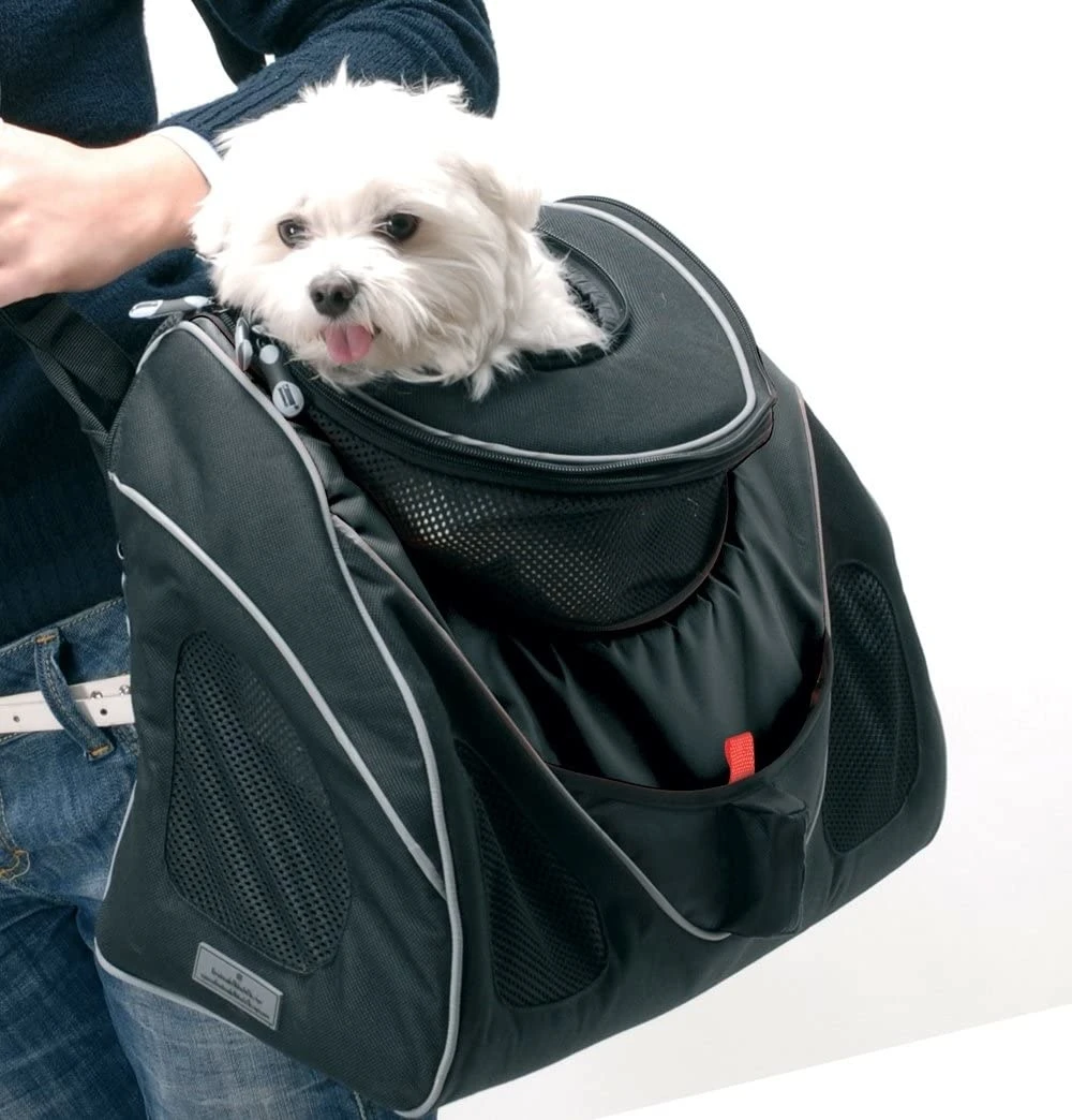 Een fraaie en multifunctionele zwarte hondendraagtas die te gebruiken is als draagtas, schoudertas of rugzak.Â