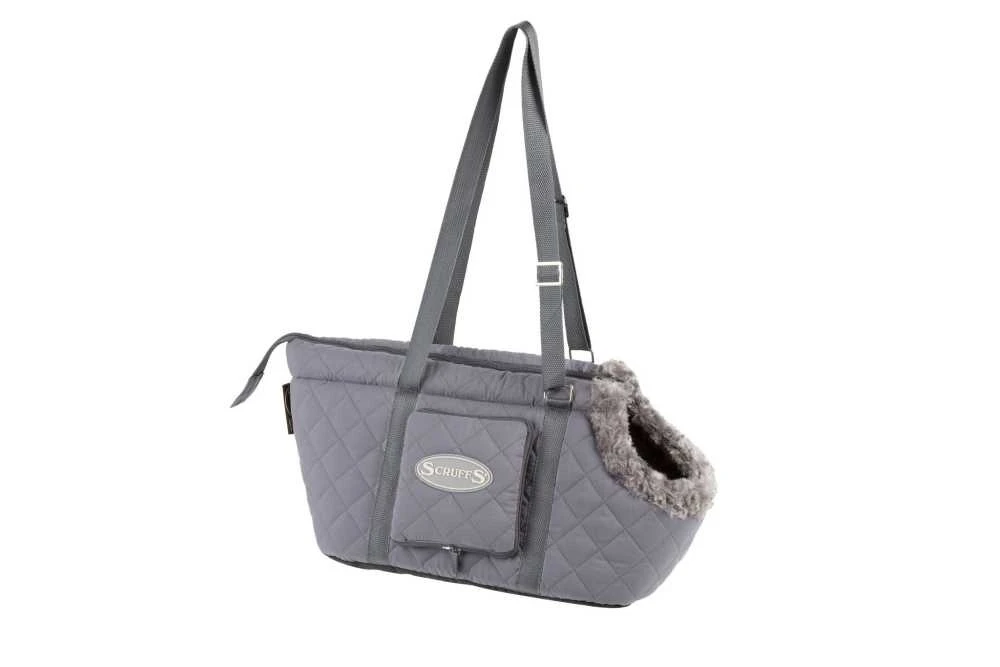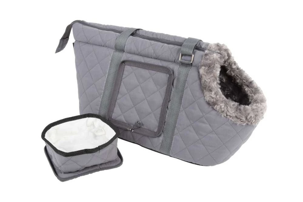Een mooie en praktische hondendraagtas, in het grijs uitgevoerd, waarmee u uw hond veilig kunt meedragen. De draagtas heeft een rits over de hele lengte van de tas, zodat u de hond er gemakkelijk in- en uit kunt halen. De neklijn is uitgesneden zodat uw huisdier de kop naar buiten kan steken en goed contact met de buitenwereld kan houden.Â