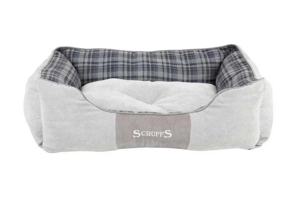Deze gezellige grijze hondenmand is gemaakt van chenille stof met een Schotse ruit en imitatie suède biezen. De mooie en levendige kleur is aan de binnenzijde met een Schotse ruit. Aan de voorzijde van de mand bevindt zich een gestikt Scruffs logo. De hondenmand geeft goede ondersteuning aan de hond.